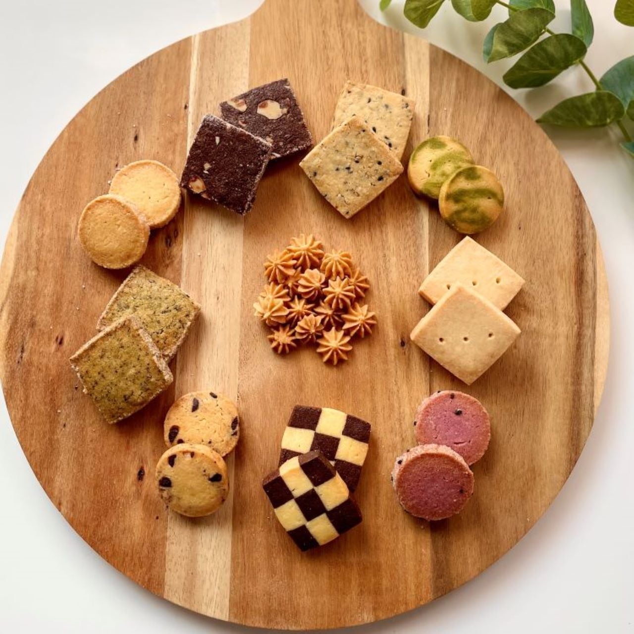 小麦粉、無塩バター、砂糖、卵、アーモンド、ココア、抹茶、ほうじ茶、チョコチップ、ごま、紫芋パウダー、苺パウダー、南瓜パウダー、バタフライピー等