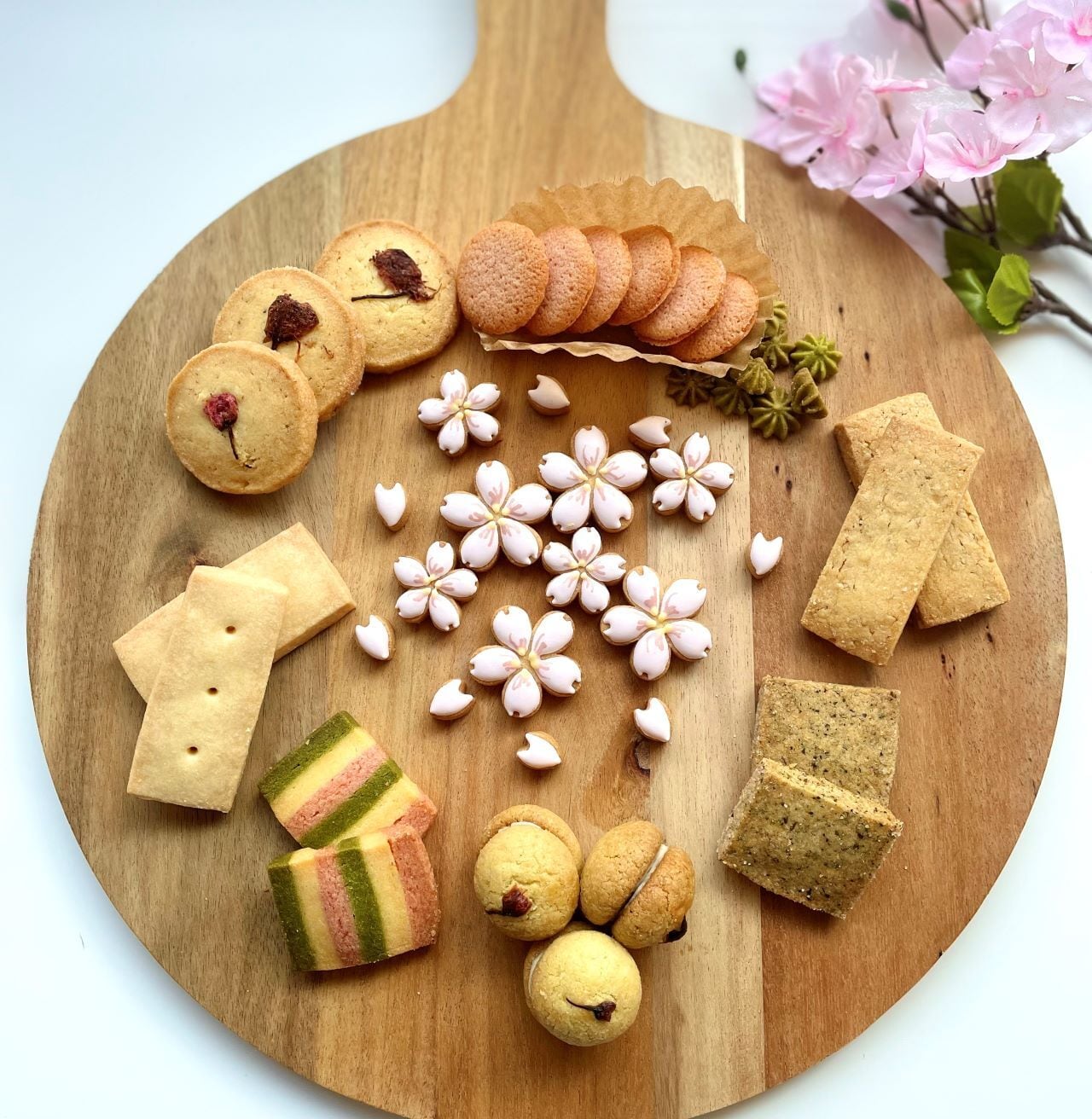 小麦粉、無塩バター、砂糖、卵、アーモンド、ホワイトチョコレート、桜、桜の葉、抹茶、ジャスミン茶葉、白ゴマ、苺パウダー、南瓜パウダー、メレンゲパウダー、ココアパウダー、塩等