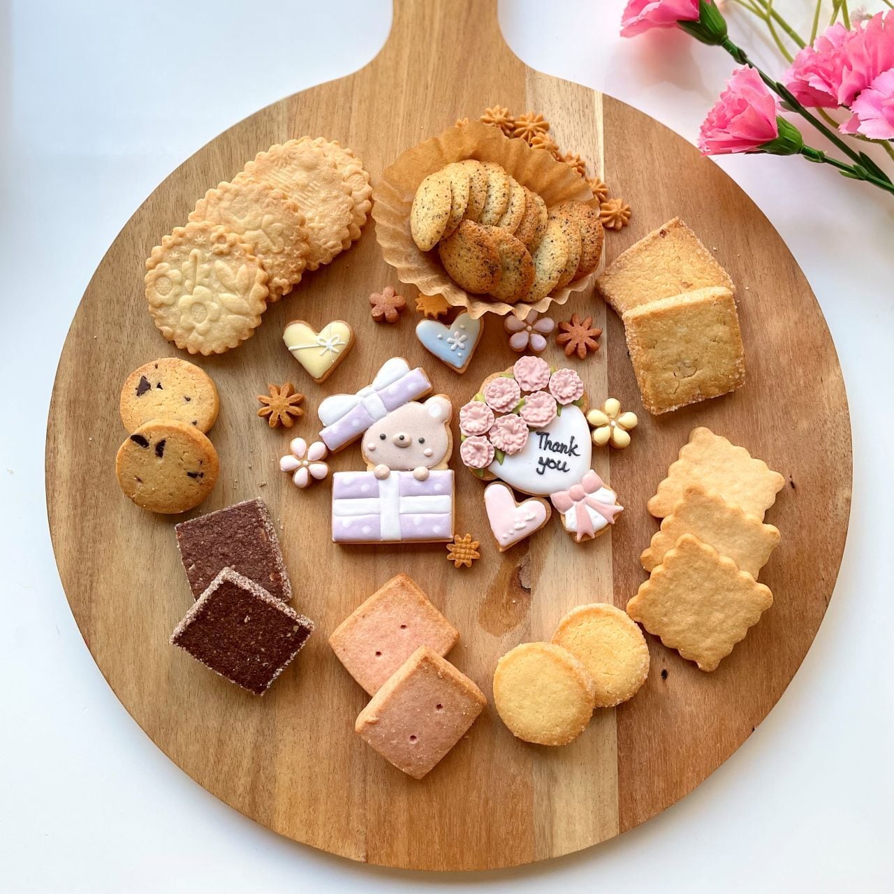 色々なお味を楽しんで頂けるようにバラエティー豊かに詰めたクッキーと可愛らしいアイシングクッキー♪で飽きずに楽しんで頂けるように仕上げました♪